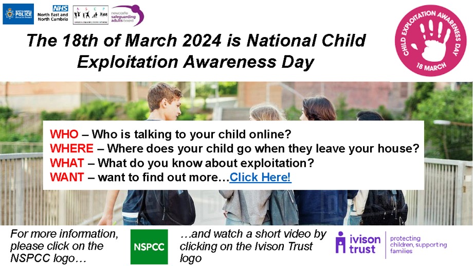Monday 18th March is National Child Exploitation Awareness Day. Please see the below resources from the Newcastle Safeguarding Children Partnership.