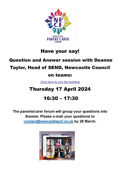 contact@newcastlepcf.co.ukThe Q&A will be on Teams on Thursday 17th April, 4:30pm-5:30pm. To join the meeting on the day, please use the link below.