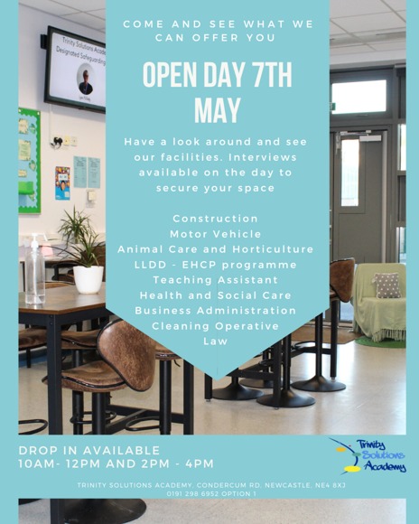 Their next event is Tuesday 7th May 2024 - drop in 10am - 12pm & 2pm - 4pm. Trinity Solutions Academy, Condercum Rd, Newcastle upon Tyne NE4 8XJ.