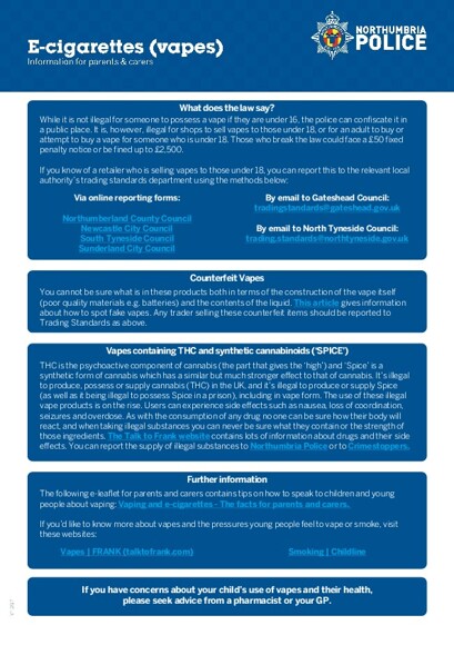 Please see below the poster from Northumbria Police on information for parents and carers on vaping.