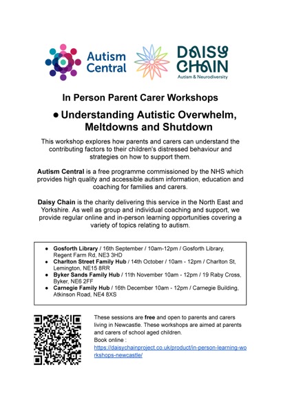 Please see the poster below about parent/carer workshops on understanding autistic overwhelm, meltdowns and shutdown.