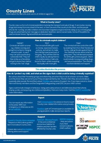 Please see the below poster with information for parents and carers on County Lines from Northumbria Police.