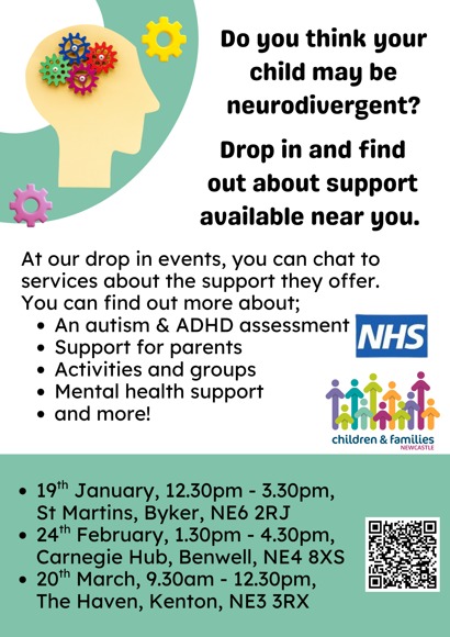 Please see below information regarding neurodevelopmental and mental health support from Chilren and Families Newcastle.